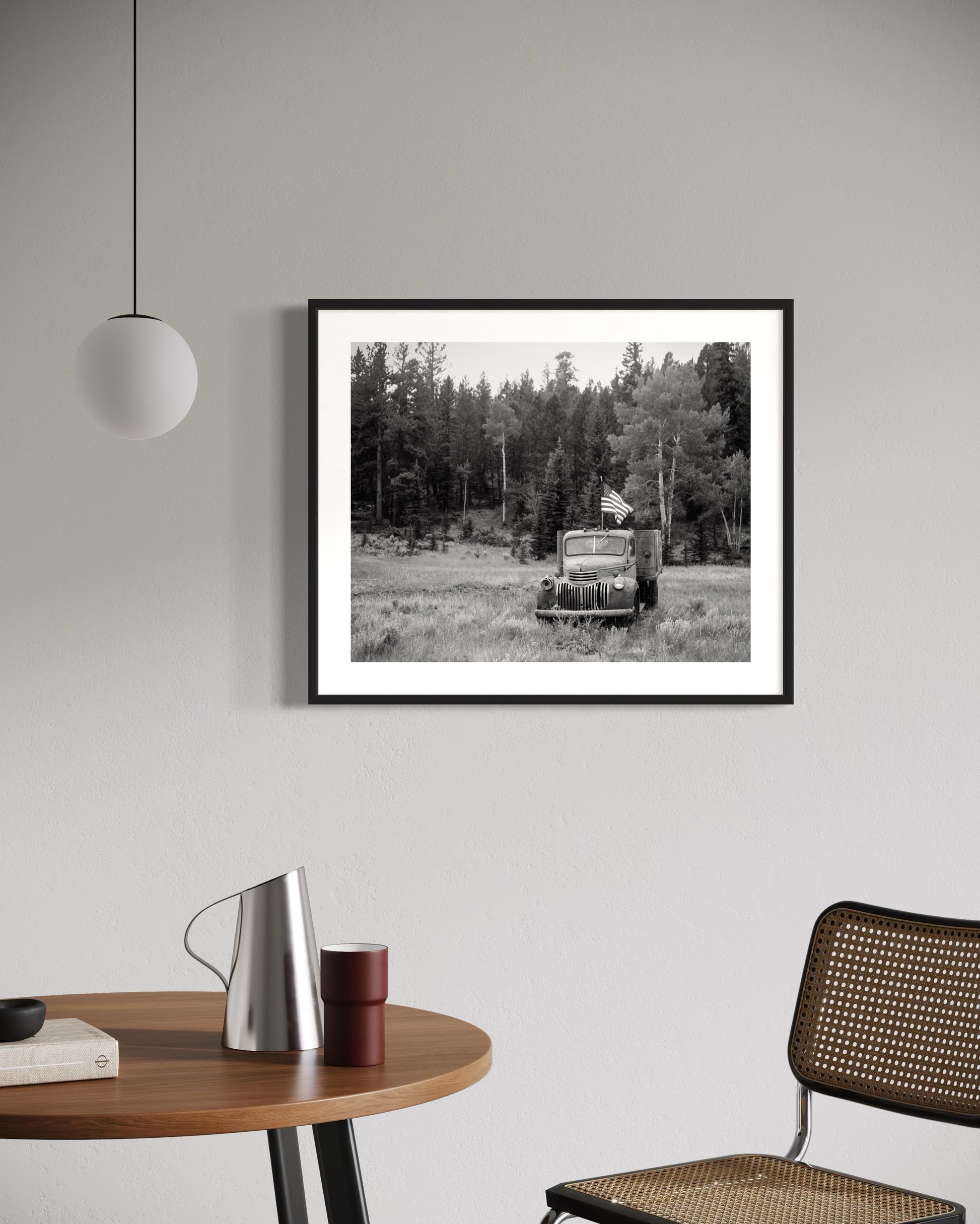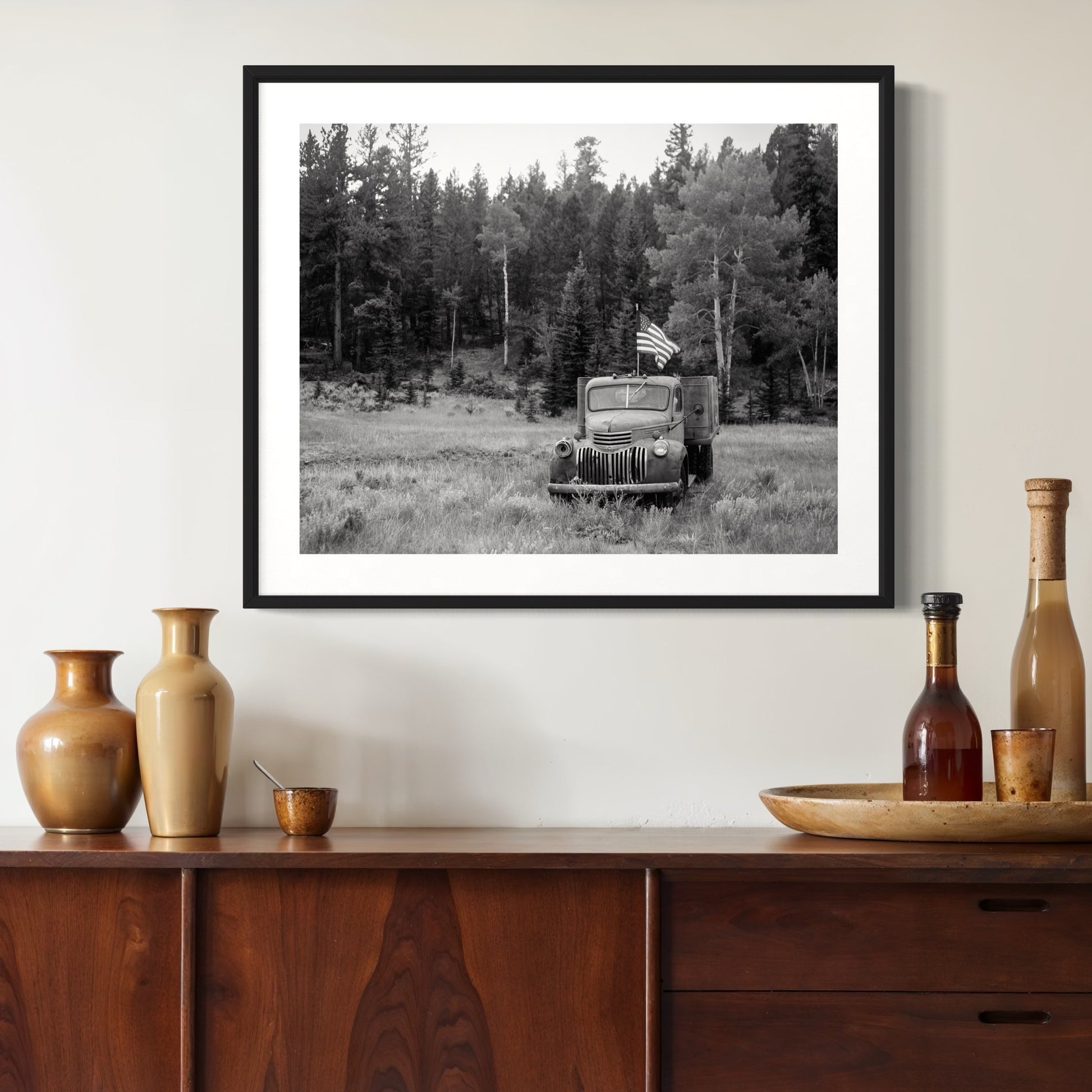 A vintage pickup tucked among the pines, flying the American flag, stands quietly off a back road near Leadville, Colorado. This black-and-white photograph captures a distinctly Western take on classic Americana—rugged, nostalgic, and proudly enduring.
