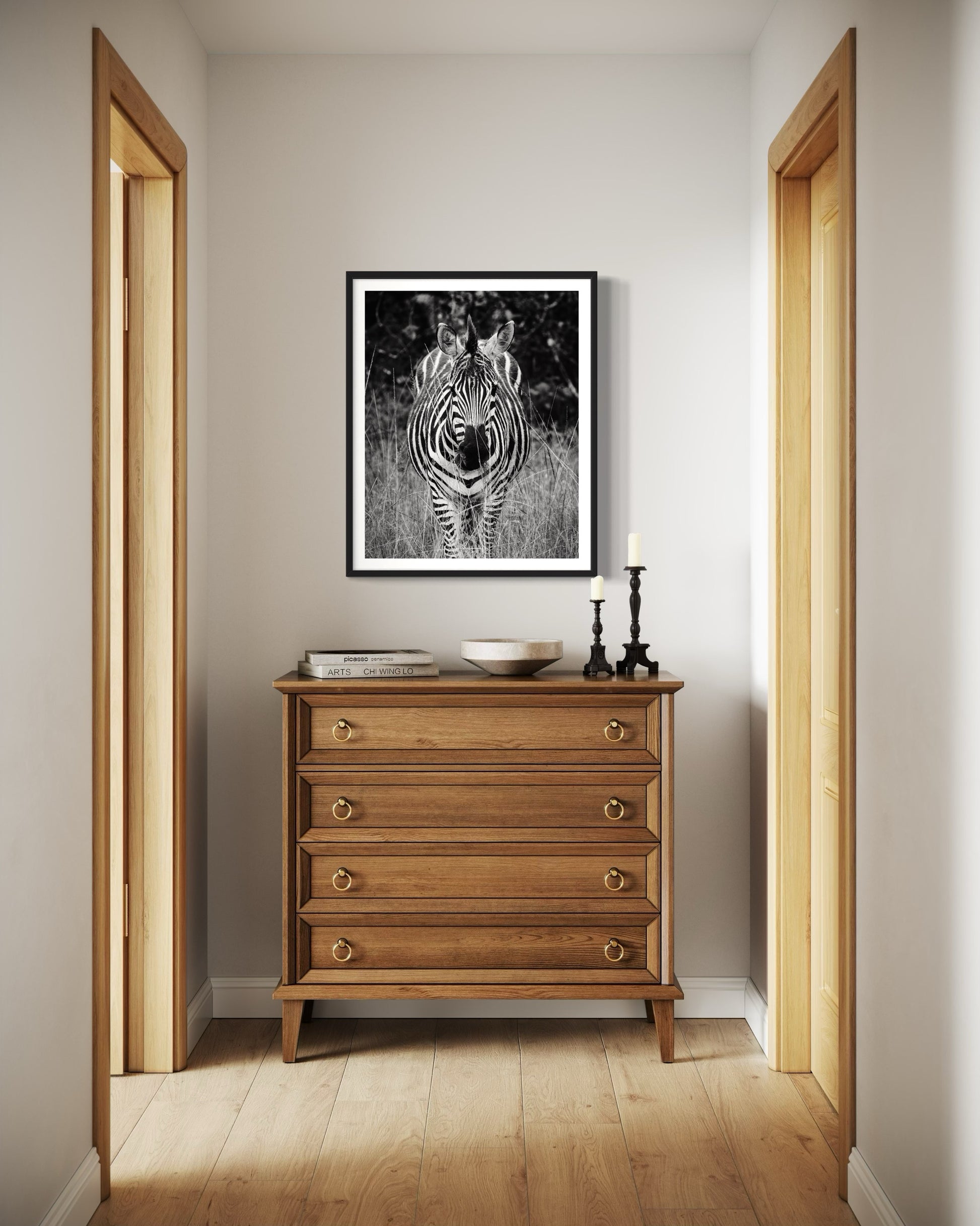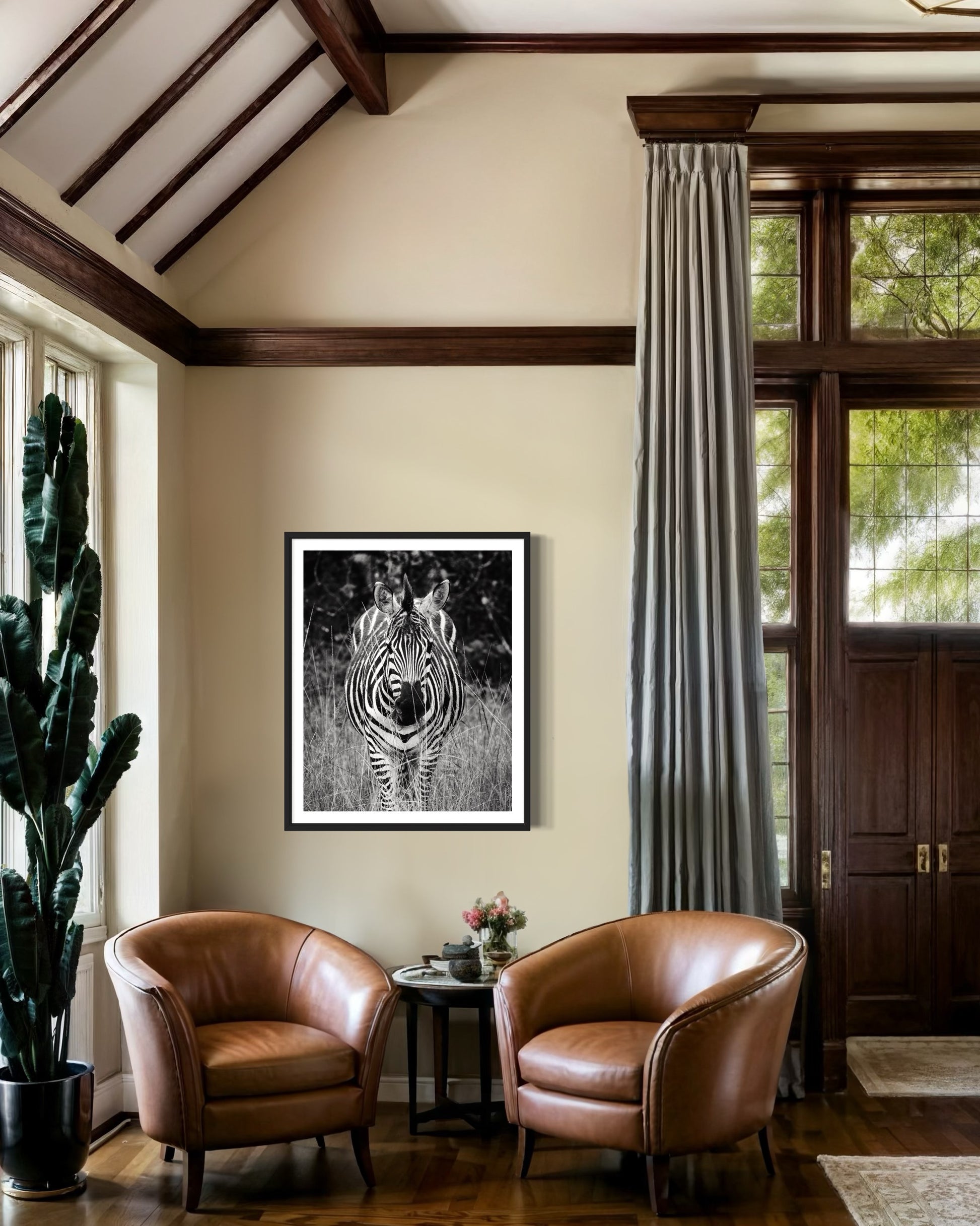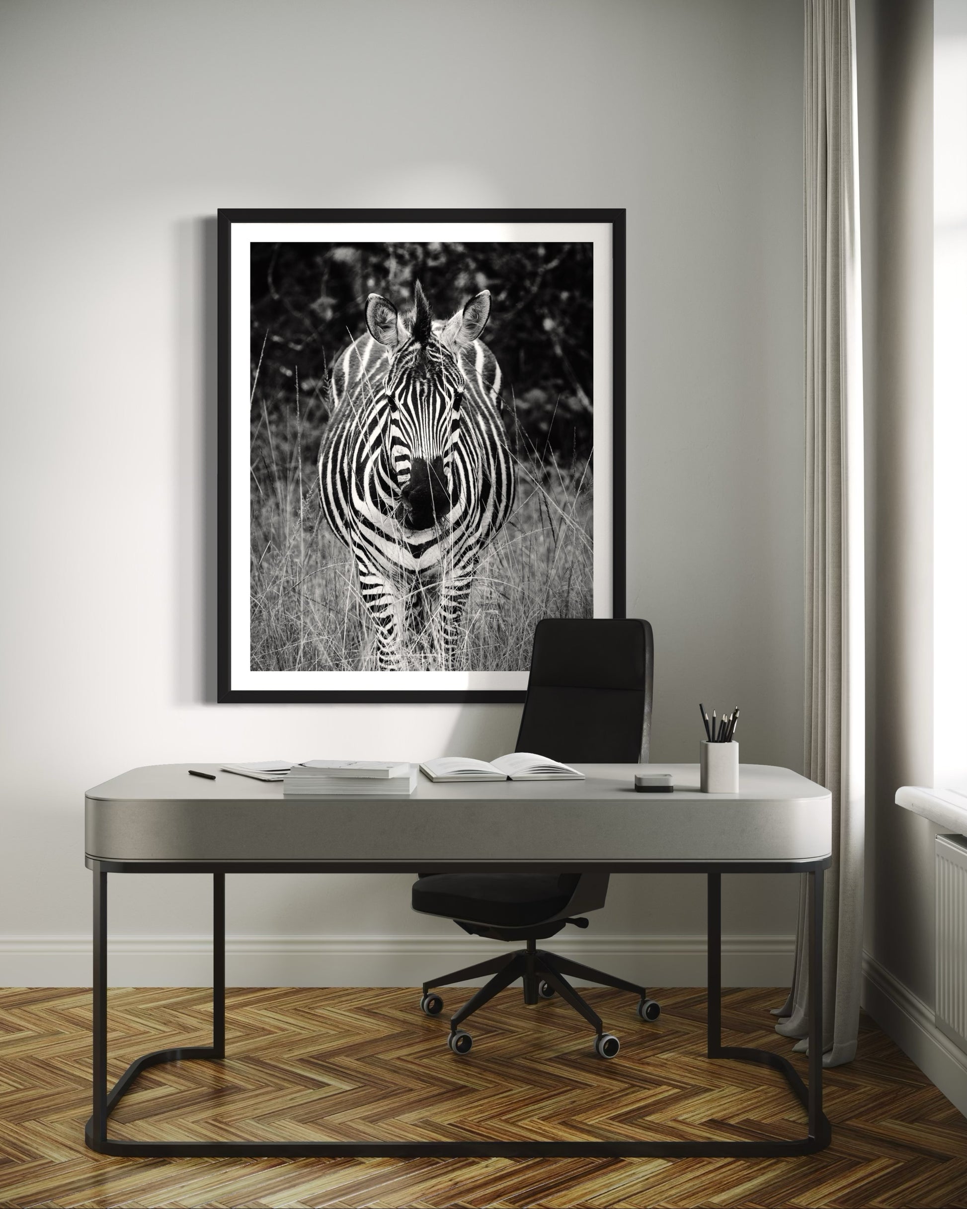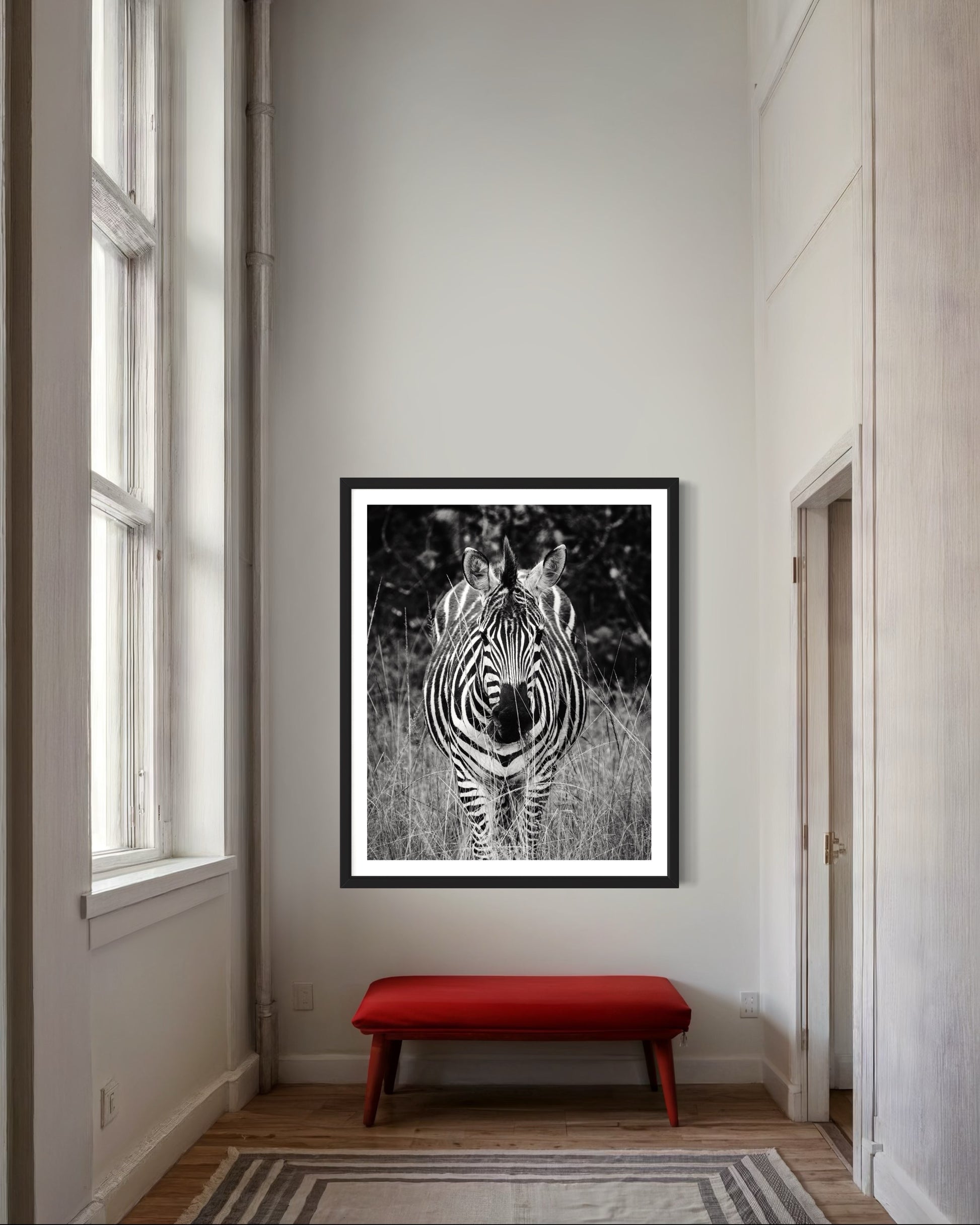 A zebra hides from predators amidst trees above the plains of the Masai Mara National Game Reserve in Kenya, home to some of the highest concentrations of African wildlife. Limited edition black and white prints available from 16x20 to 40x50. Framed, print only and acrylic mounted options available in all sizes.