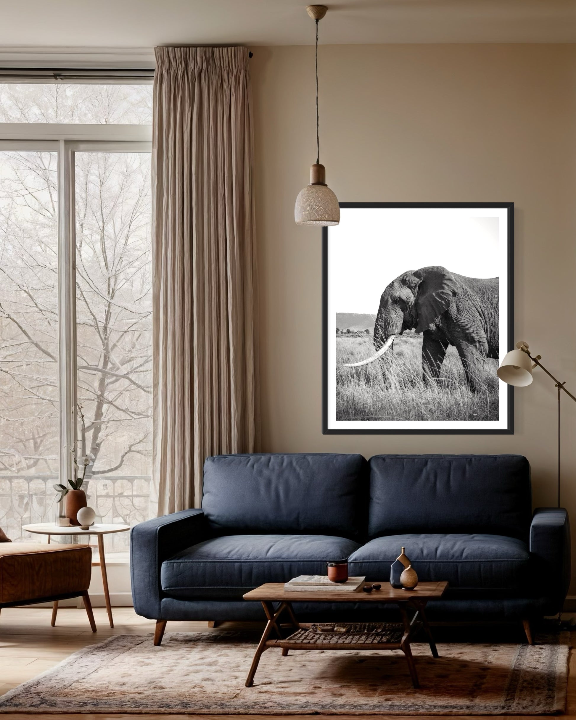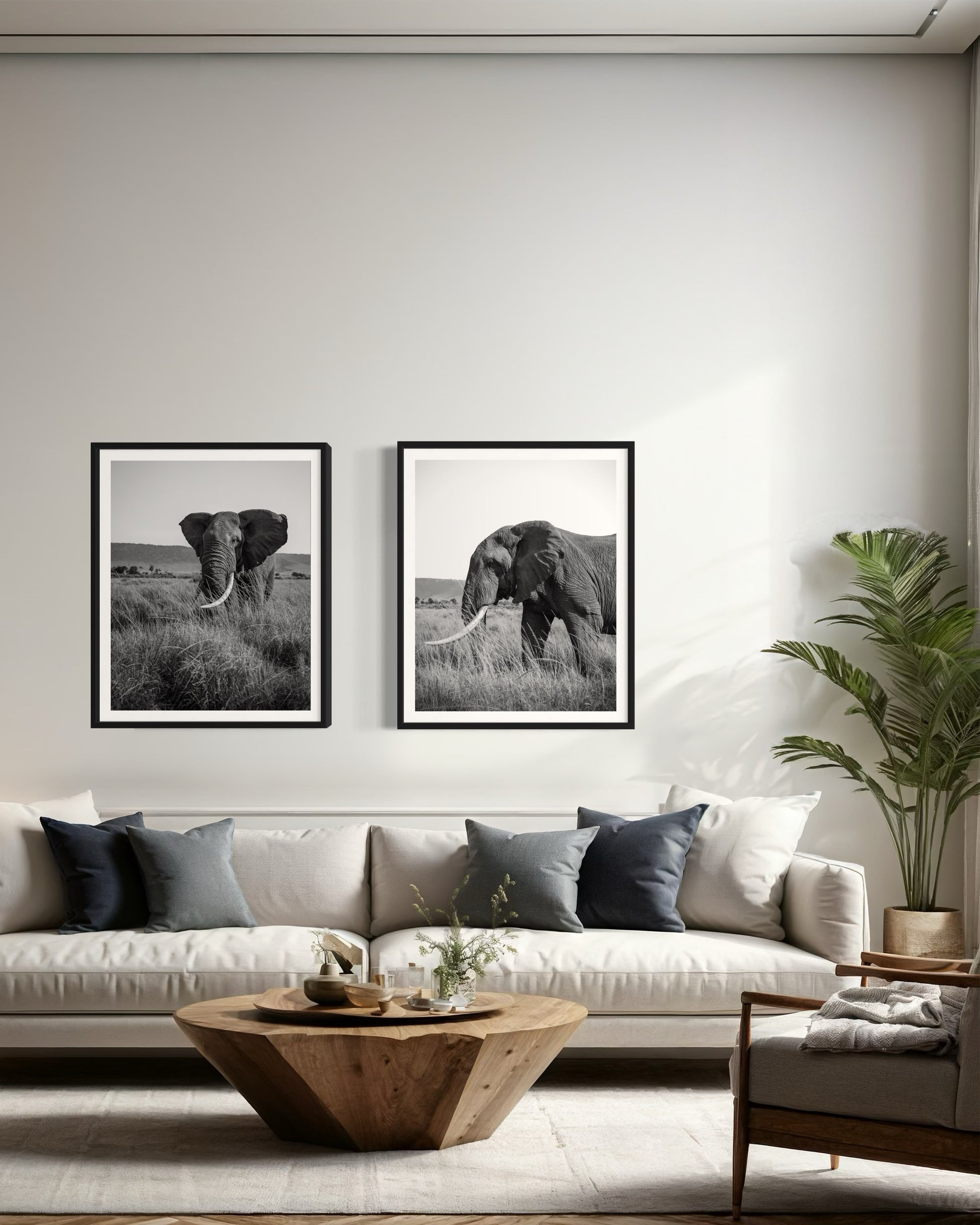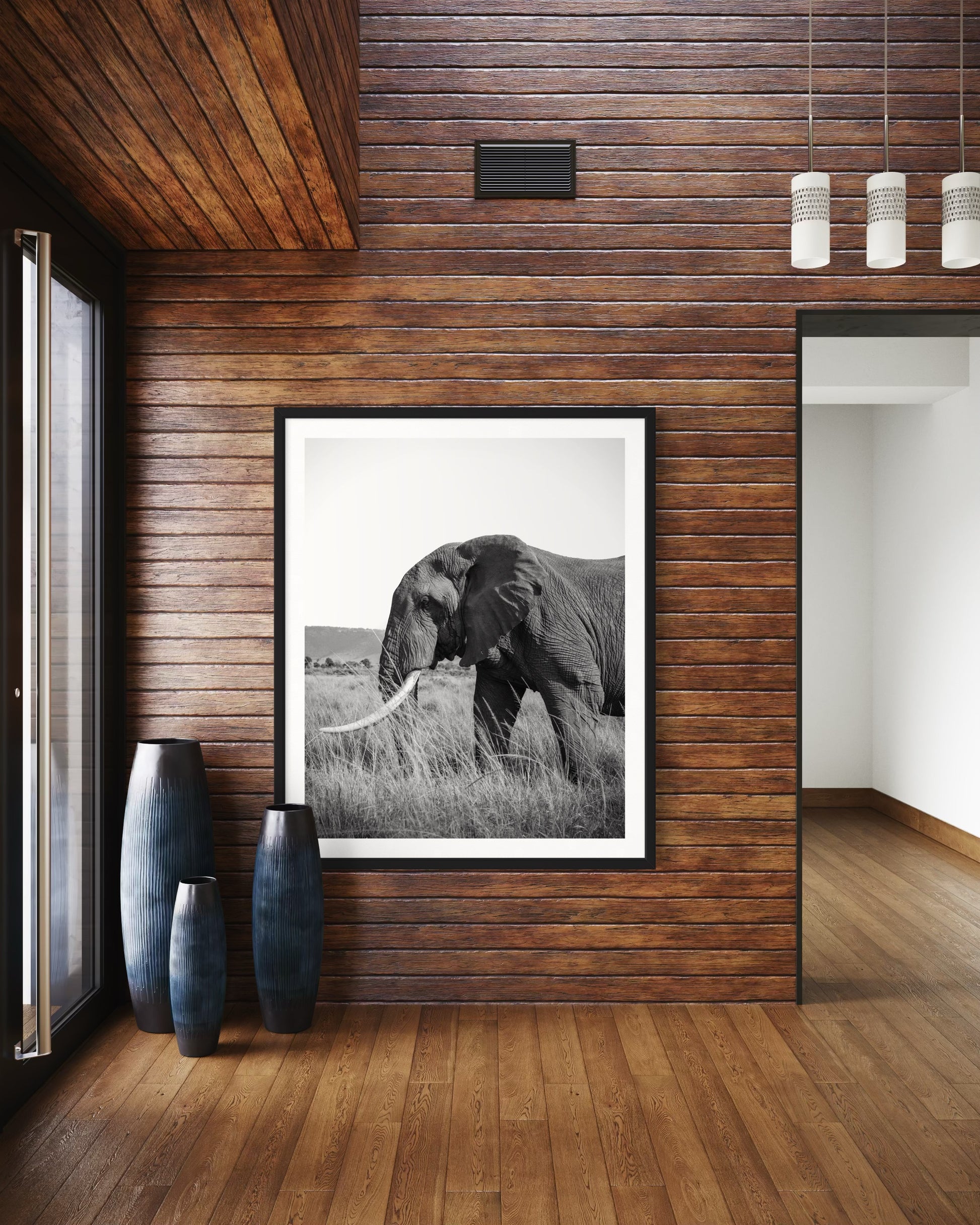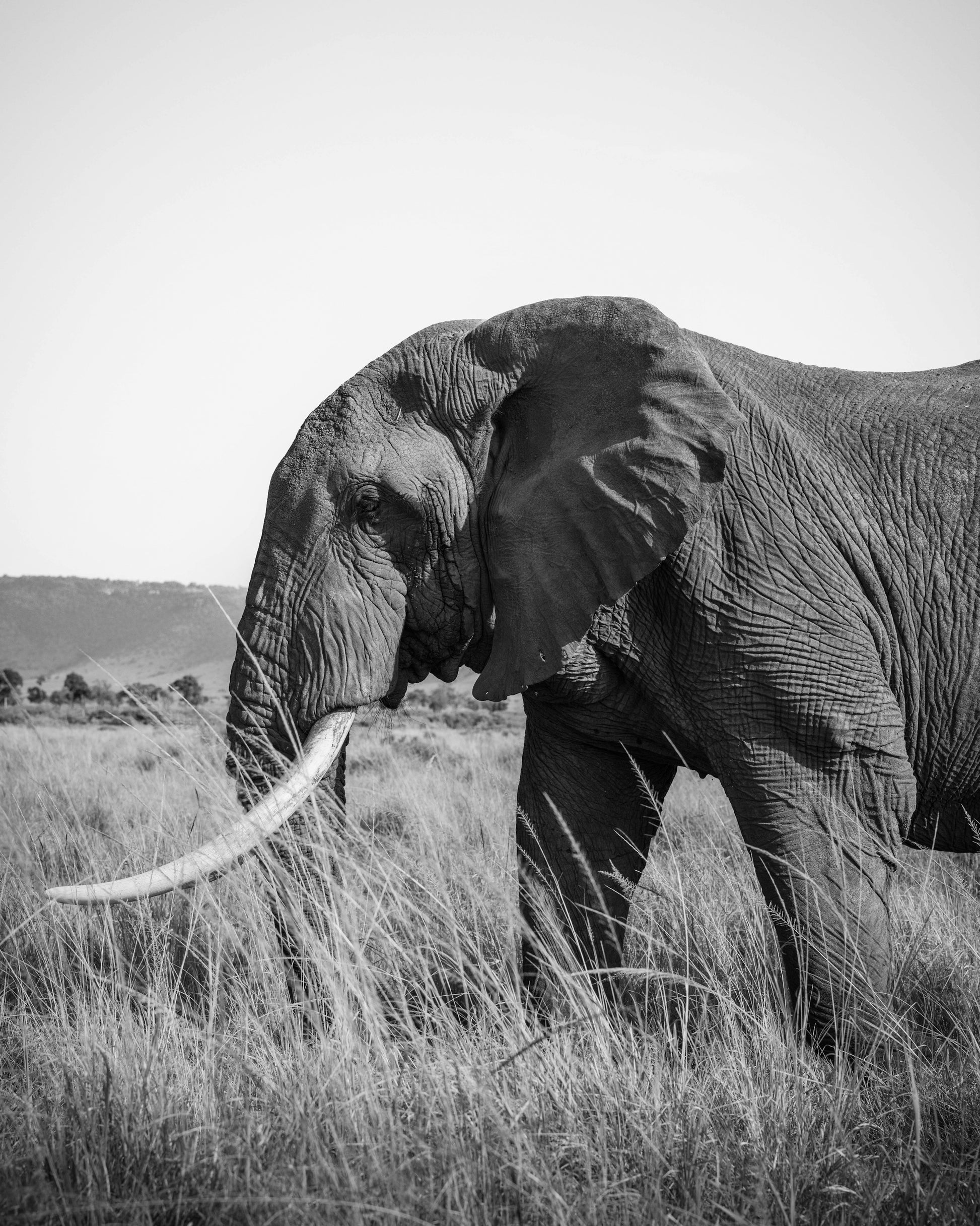 A large bull elephant roams across the plains of the Masai Mara National Game Reserve in Kenya, home to some of the world’s highest concentrations of African elephants and big cats. Limited edition black and white prints available from 16x20 to 40x50. Framed, print only and acrylic mounted options available in all sizes.