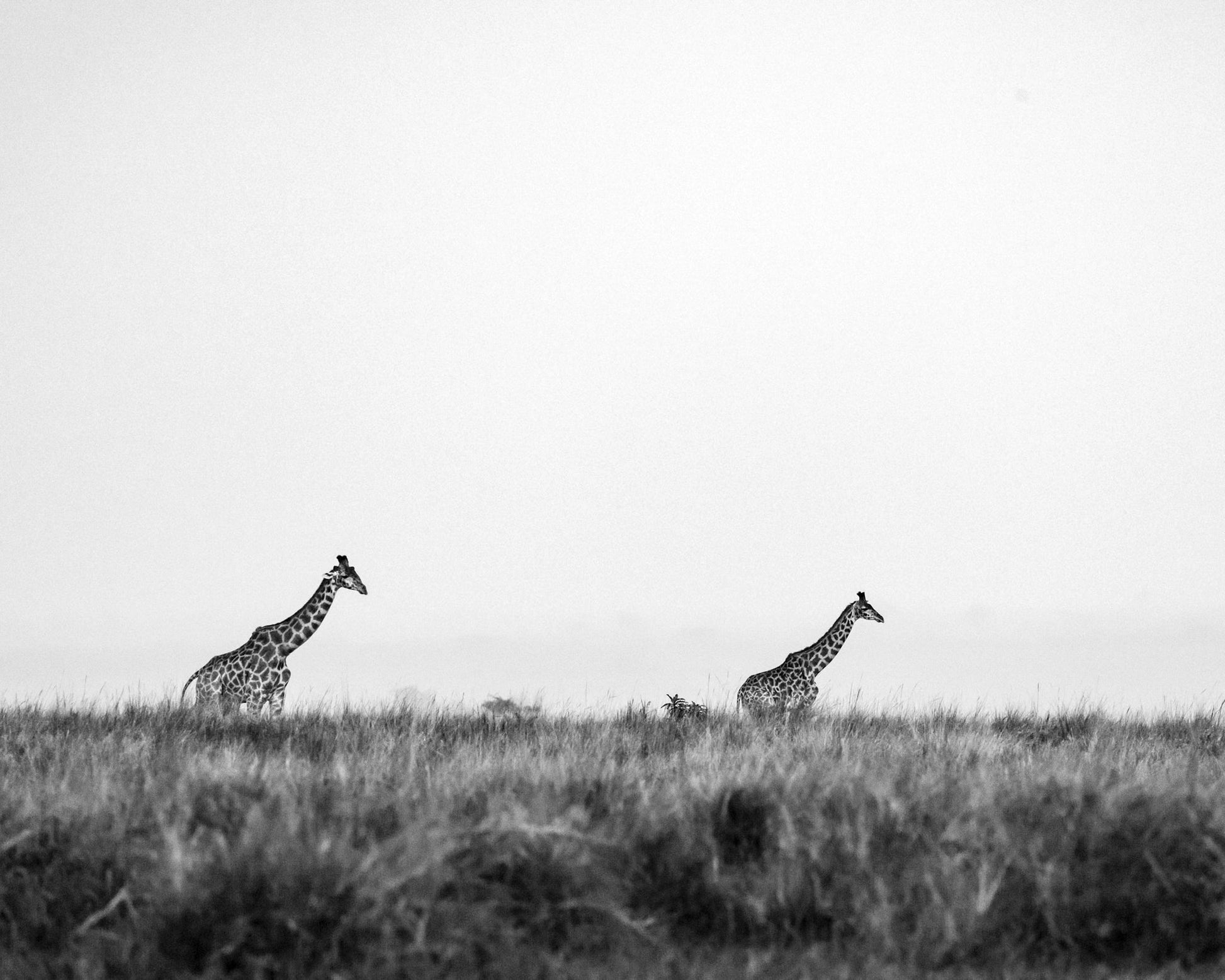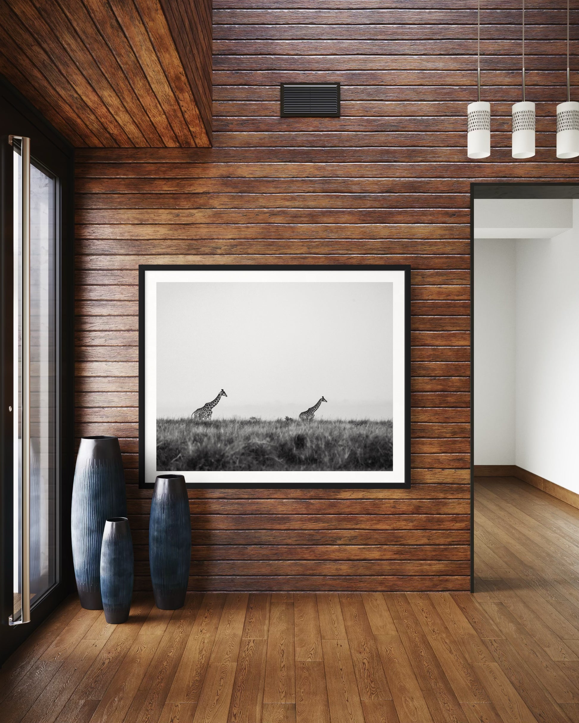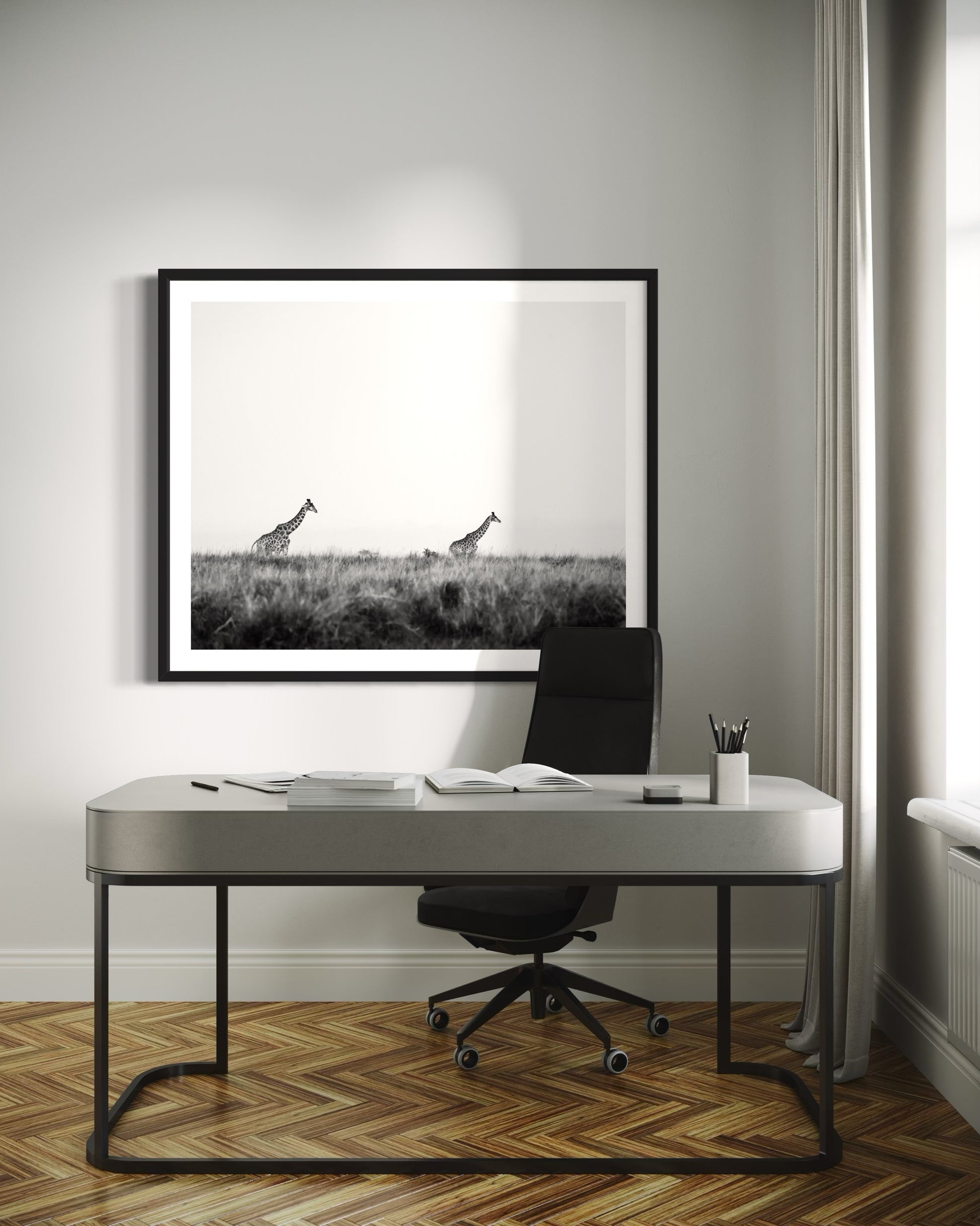 A pair of adult giraffes walk across the plains of the Masai Mara in Kenya, home to some of the world’s highest concentrations of African elephants and big cats. Limited edition black and white prints available from 16x20 to 40x50. Framed, print only and acrylic mounted options available in all sizes.